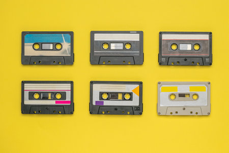 Six audio cassettes with magnetic tape on a yellow background. Vintage audio recording storage and playback tools.