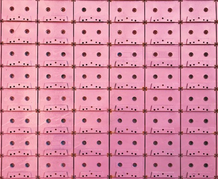 Pink wall made entirely from cassette tapes for background or backdrop