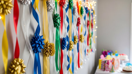 A wall is decorated with vertical strips of colorful ribbons and matching bows in blue, gold, red, and silver. Blurred party elements in the background suggest a festive birthday or celebration setting.