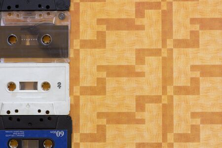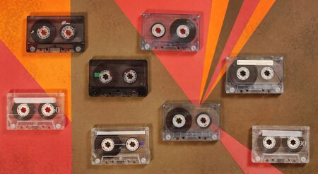 Old audio cassettes with retro music. View from above. Music media from previous years.