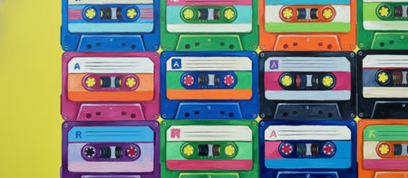 Retro cassette tapes arranged in a vibrant textured grid on a bright yellow background, evoking 80s90s nostalgia, pop art colors and vintage music culture energy
