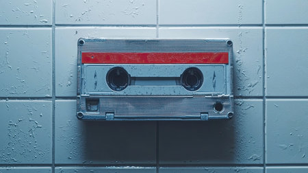 The cassette tape lies flat on a textured tiled surface, surrounded by droplets of water, evoking a sense of nostalgia and retro vibes. The vibrant label adds a pop of color.