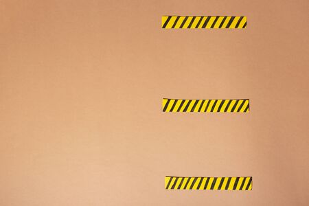 Construction colored adhesive tape, electrical insulating tape on a light background. Top view, flat lay. Banner.