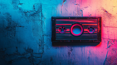 A vibrant neon cassette tape embodies s nostalgia, symbolizing the golden era of music on analog media. Perfect for fans of retro culture, vintage aesthetics, and colorful designs reflecting the