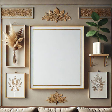 Framed visuals of diverse subjects are arranged on a sleek wall, creating a captivating gallery that combines modern design with artistic expression.
