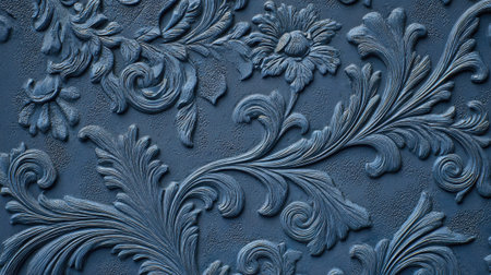 An intricately blue floral pattern with textured, detailed leaves and flowers, emphasizing artistic style and craftsmanship. AI generated image