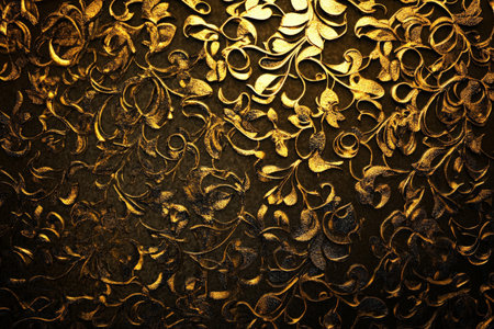 Abstract glowing filigree texture, intricate gold patterns illuminated softly on a dark background, luxurious and ornate