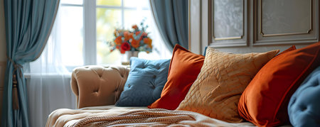 A cozy sofa adorned with decorative pillows in an array of soft colors, creating a stylish and inviting atmosphere perfect for relaxation and comfort.