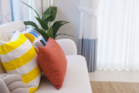 Multi-colored pillows on a beige fabric sofa, the concept of home comfort and cozy, copy space, close-up