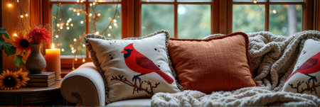 Cozy autumn living room with cardinal cushions and fairy lights. That the image is generated using AI.