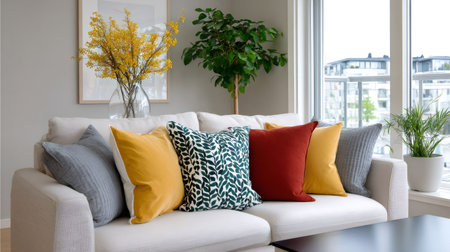 A cozy living room scene showcasing a modern sofa adorned with soft decorative cushions in various colors. A vibrant houseplant adds a fresh touch.