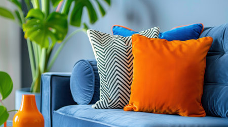 A cozy modern living room featuring a plush blue sofa adorned with vibrant orange and geometric patterned cushions, complemented by decorative greenery.