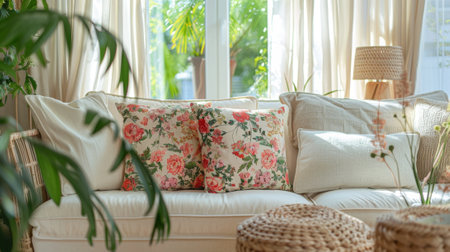 floral home decor, airy, floral-themed decor fills the sunlit interior, with curtains and pillows adding a harmonious and inviting atmosphere to the space