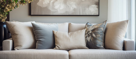 Blank neutral-colored pillow on a modern gray sofa, perfect for a minimalist and cozy living space