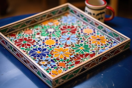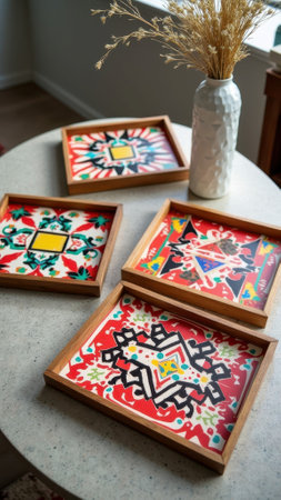 Colorful geometric patterns on trays with wooden frames on a table. That the image is generated using AI.
