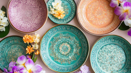 Colorful floral patterned trays on tabletop display. That the image is generated using AI.