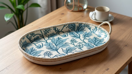 Elegant oval tray with blue floral pattern on wooden table. That the image is generated using AI.