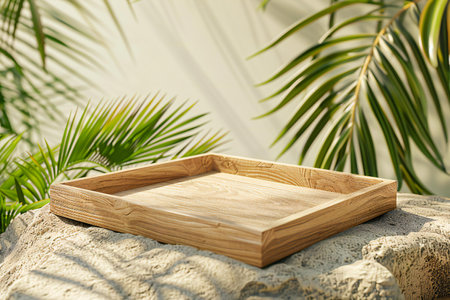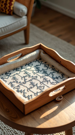 Wooden tray with leaf pattern on coffee table in sunny living room. That the image is generated using AI.