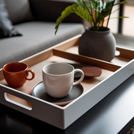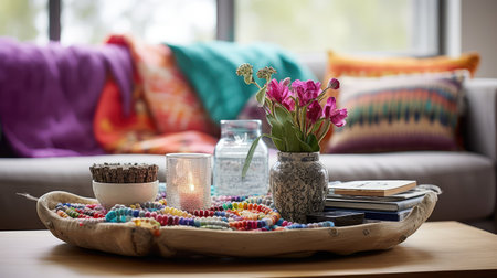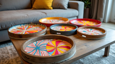 Colorful decorative trays on wooden coffee table in modern living room. That the image is generated using AI.
