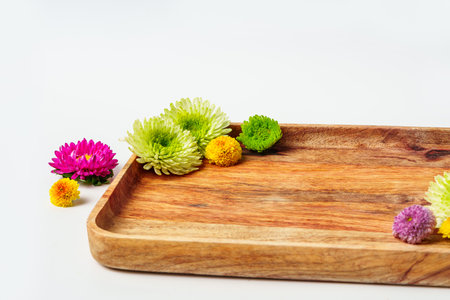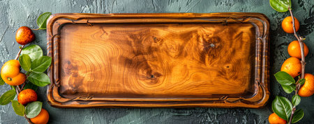 Exquisite Wooden Serving Platter Surrounded by Fresh Tangerines on a Rustic Green Background Perfect Kitchen or Dining Decor AI Generative