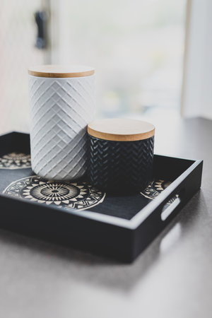 sugar and coffee canisters on boho breakfast tray, concept of organised minimalist kitchen shot at shallow depth of field