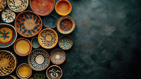 A beautifully arranged flatlay of traditional textiles, pottery, and natural elements on a table. This composition showcases vibrant colors and intricate designs, reflecting artisan craftsmanship and cultural heritage.