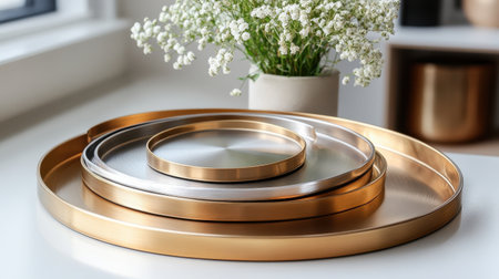 A sophisticated display of elegant golden plates with a textured surface resting on a modern gray dish. Perfect for upscale dining settings.