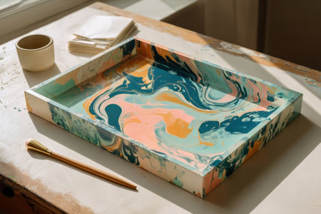 A colorful marbled tray showcases swirls of blue, peach, and green on a wooden table. Nearby, a paintbrush and some paper napkins add to the artistic setting.
