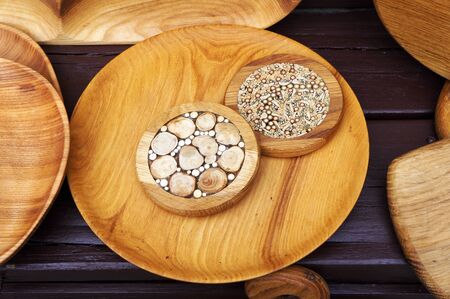 Handcrafted wooden bowls and trays with geometric patterns on table. That the image is generated using AI.