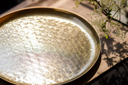 The Artistry of an Ornate Engraving on a Silver Serving Tray Illuminated by New Year's Eve Festive Lights