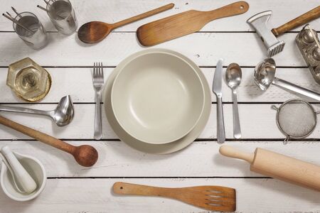 Place setting for one person prepared on a wooden table made of white boards. Old stylish kitchen utensils are spread out around. The whole creates an interesting background.