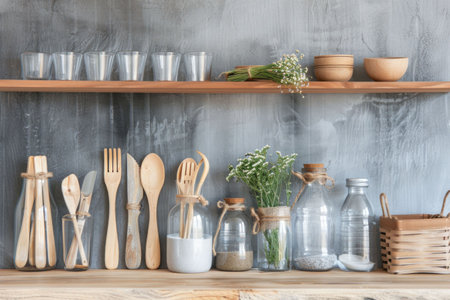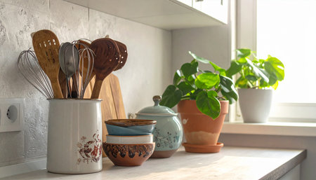 A cozy kitchen scene featuring a wooden counter adorned with utensils, glass jars, and plants. Perfect for capturing the warmth of home cooking and design.