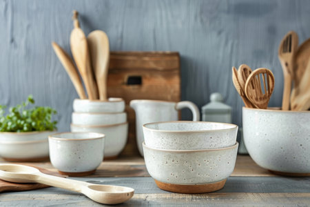 This image showcases an elegant arrangement of natural textured tableware and wooden utensils, emphasizing minimalist design and rustic charm. Perfect for home decor inspiration.