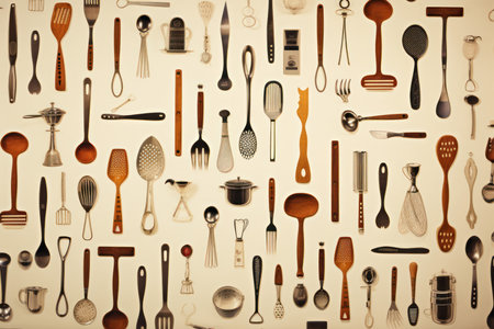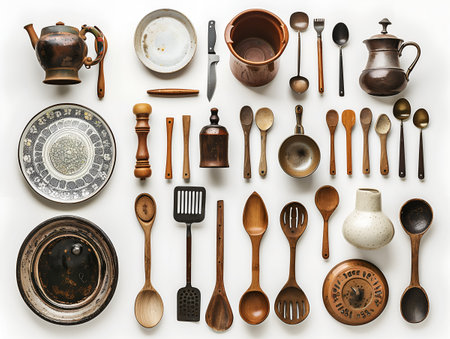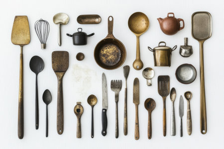 Various kitchen tools including spatulas, whiskeys, and spoons are neatly arranged on a white backdrop, perfect for culinary designs.