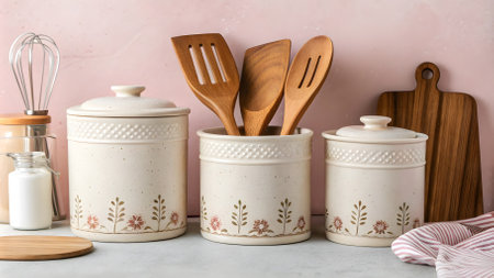 A cozy kitchen scene featuring wooden utensils, ceramic containers, and rustic decor on a wooden surface, showcasing an inviting and homey atmosphere.