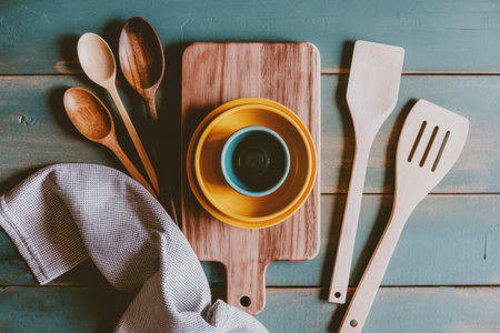 Organized kitchenware set, top view, against a split backdrop of teal, orange and gray. Dishes and wooden utensils