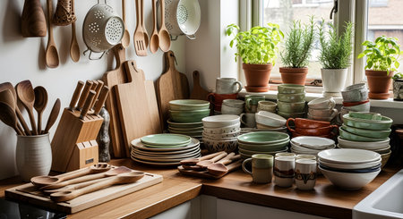 A charming rustic kitchen corner featuring stacks of handmade ceramic bowls wooden cutting boards and utensils. Fresh potted herbs like rosemary and basil sit by the window adding a touch of nature to the cozy culinary workspace.