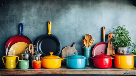 This vibrant arrangement of colorful cookware and utensils on a rustic kitchen shelf showcases a blend of modern and traditional elements, perfect for culinary inspiration.