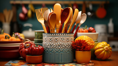 This charming kitchen scene features a collection of wooden utensils, a white pot, and rustic decor, creating a warm and inviting atmosphere for cooking.