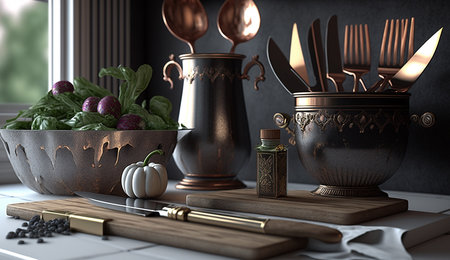 edgy flatlay of metal cooking tools against black background, created with generative ai