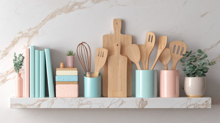 A modern kitchen shelf displays wooden utensils, pastel-colored decor items, and plants against a sleek marble background, creating a stylish and inviting culinary atmosphere.