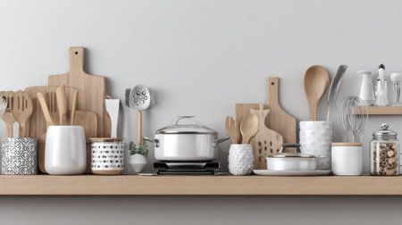 A cozy kitchen scene featuring a wooden shelf filled with various cookware and utensils. Perfect for illustrating modern culinary lifestyle and home decor.