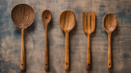 A beautiful arrangement of various wooden kitchen utensils against a warm brown background. This image evokes a cozy and natural atmosphere perfect for culinary inspiration.