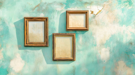 Three empty picture frames in different sizes hang on a weathered turquoise wall, showcasing an artistic distressed finish perfect for creative decoration.