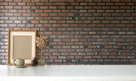 Empty picture frame and coffee cup on white table with brick wall. Copy space for graphics display montage.