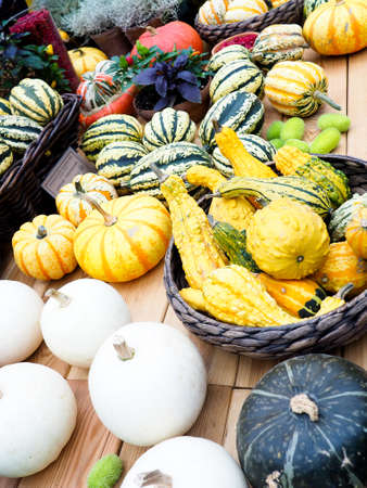 Autumn harvest colorful pumpkins and squashes in different varieties at farm market or seasonal festival. Background of decorative fall and winter squashes