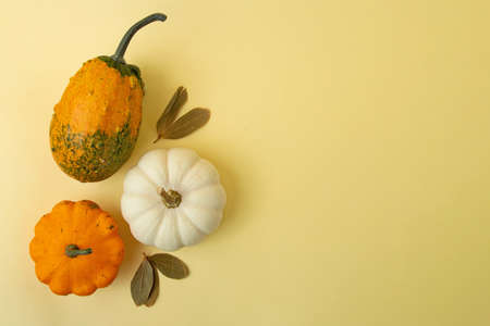 Creative autumnal composition with squash, pumkin, fallen leaves and oat. Minimal still life. Close-up