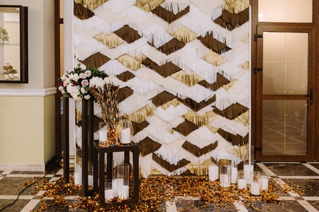 Beautiful handmade background for photos during the holiday. Photozone at a wedding in style of Gatsby
