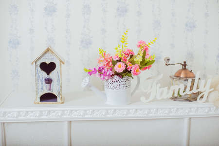 Home decor spring. Grinder and a vase of spring flowers in the style Shabby chic. White label family