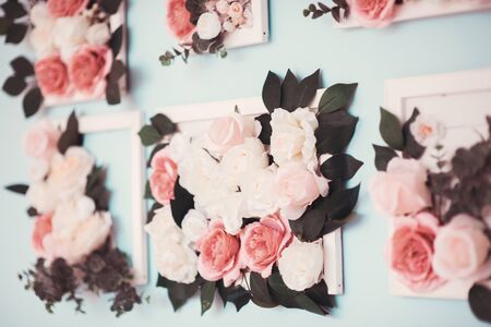 bouquet of white roses in a vase, picture frame on a blue background on the table